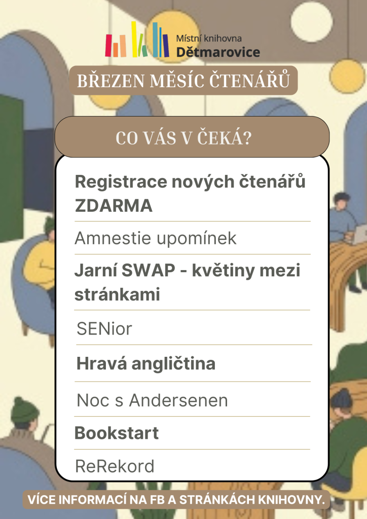Tento měsíc probíhá i v naší knihovně celorepubliková akce "Březen měsíc čtenářů" a v rámci této akce se můžete těšit na speciální akce. Čekají vás ale i tradiční akce jako Bookstart, SENior nebo Hravá angličtina.